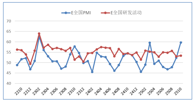 中采咨询于颖认为:“2025年10月战略性新兴产业epmi如期大幅回升至59.7%,为阶段性高点,也提示新兴产业的资本扩张周期仍在向上。本月epmi创31个月新高,且为5年来同期最高,环比值7.3个百分点也是历史上除3月份以外的最高值。全球新技术开支扩张,中国新质生产力产品大行其道,关税环境趋紧,都是本月秋旺弹性强于往年的重要原因。各分项回升明显。新订单和出口订单都是31个月新高,需求全面回暖:新订单大幅回升,出口订单连续3个月回升,本月大幅回升有一定的抢单效应。生产量65.8%,出现2021年10月以来第一次旺季的产需差负值,一方面说明需求扩张更强,另一方面反映“反内卷”政策延续压制产能过剩状态,可能预示新兴产业出现一定的顶点迹象。企业采购加速,采购量和自有库存大幅回升至中高位;进口回升,延续此前升势,高于近年均值,进出口差值大幅回升,创历史最高。不过,用户库存同步升高分位,或将压制企业未来产能。购进价格连续3个月、销售价格连续4个月回升,且都高于近4年均值,价格持续回暖,拉动需求,企业盈利能力修复,产业景气上行。经营预期高于近4年均值,企业极尽乐观。研发活动与新产品投产双双回升,新品投产创19个月新高且为2021年春季以来首次旺季高于60%,前期研发投入高效、大规模地转化为实际生产力。就业54%,处中高分位,员工薪酬处中低分位,低于近年均值,生产率显著提升,但企业支出谨慎,薪酬增长相对乏力。贷款难度微升中位,企业融资压力边际走升;应收账款连续回升,创65个月新高,反映销售旺盛。秋周期过顶,预计下个月epmi回落。”