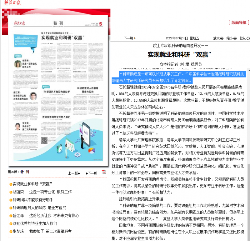 清华大学公共管理学院教授、清华大学中国科技政策研究中心副主任梁正分析,在今天“数据科学”研究范式日益兴起,大数据、人工智能、社会实验、心理测试等先进方法日益得到广泛应用的背景下,对相关专业特别是跨学科背景的科研助理提出了更多需求。从这个角度来看,科研助理岗位不应单纯被视为高校毕业生就业的“缓冲区”或“跳板”,而是在现代科学研究日益复杂化、组织化、专业化分工背景下的一种必然,同样需要专业化人才来承担。